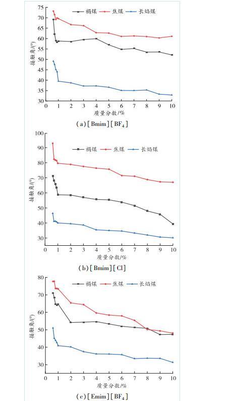 2)當(dāng)質(zhì)量分數(shù)達到某個特定值之后,離子液體中的官能團與煤中基團達到穩(wěn)定結(jié)構(gòu),溶液接觸角的變化開始減緩。將3種煤樣的接觸角進行對比發(fā)現(xiàn),長焰煤和褐煤的親水能力大于焦煤,這可能與煤中親水基團和疏水基團的含量有關(guān)?;钚运芤涸陔x子液體質(zhì)量分數(shù)相同時接觸角大小排序為[Emim][BF4]>[Bmim][BF4]>[Bmim][Cl]。