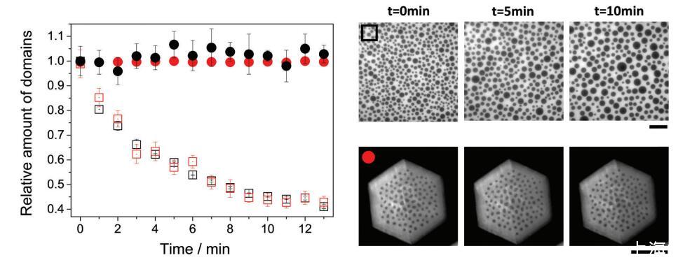 圖 5 帶電(圓形)和中性(方形)雙層(紅色)或單層(黑色)的域相對(duì)數(shù)量與時(shí)間的關(guān)系。 這些圖像是一個(gè)例子 中性單層(上)和帶電(下)雙層在指定時(shí)間。 圖像中包含的符號(hào)對(duì)應(yīng)于圖像中的相同符號(hào) 形象的。 比例尺對(duì)應(yīng)于 50 毫米。