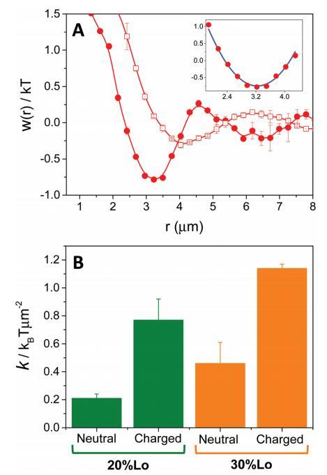 圖 4 (A) 域之間的平均力勢(shì) w(r) 從 由帶電(圓圈)或 中性(正方形)域。 插圖:擬合實(shí)驗(yàn)的例子 數(shù)據(jù)(藍(lán)色曲線)對(duì)應(yīng)于 20%Lo 的帶電域。 (B) 春天 諧波電位常數(shù),通過(guò)擬合 w(r) 的第一個(gè)谷值獲得 為中性和帶電雙層的二次函數(shù)(見 A 中的插圖) 以指定的液體順序百分比。