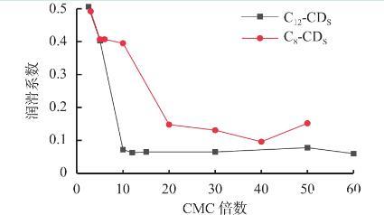 C12-CDS和C8-CDs的潤(rùn)滑效果存在明顯差異,兩者疏水烷基鏈長(zhǎng)度不同,而烷基鏈長(zhǎng)度可影響表面活性劑的表界面活性以及膠束的形成,推測(cè)是CDs形成的膠束在潤(rùn)滑過(guò)程中發(fā)揮作用,由此進(jìn)一步探究CDs的膠束對(duì)潤(rùn)滑性能的影響,圖2是CDs的硅酸鈉溶液潤(rùn)滑系數(shù)與2種CDS各自的CMC倍數(shù)的關(guān)系曲線。