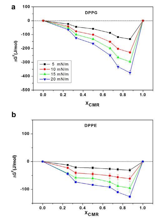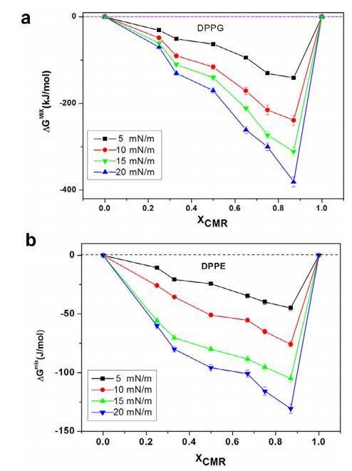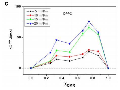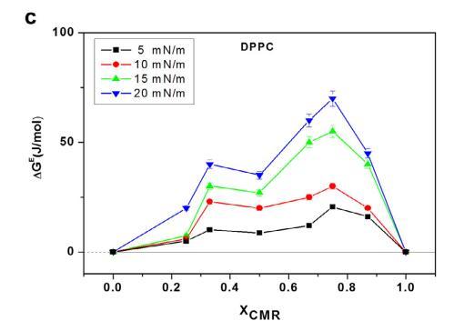 CMR/DPPG 混合膜的 ?Ge 和 ?Gmix 表示負(fù) 從 XCMR ≥ 0.25 到 XCMR = 1.0 的偏差(圖 7a 和 8a)。 ?Ge 和 ?Gmix 負(fù)值表明 CMR/DPPE 單層是 熱力學(xué)穩(wěn)定(圖 7b)。 ?Ge 和 ?Gmix 值為 DPPC 混合單層陽性,表明不混溶 (圖 7c 和 8c)。 分子之間的距離取決于 在導(dǎo)致排斥的磷脂頭部基團(tuán)上 互動(dòng)(邁爾斯,1999 年;博格斯,1987 年)。
