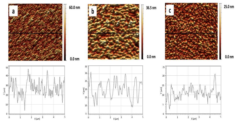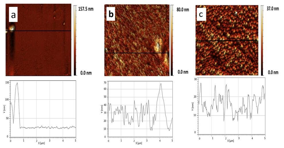 圖 9 顯示了純磷脂單層的 AFM 圖像 在 p = 20 mN/m 時(shí)轉(zhuǎn)移。 純磷脂顯示出均勻的 均方根 (rms) 等于 0.219 nm 的圖案, DPPG、DPPE 和 DPPC 分別為 0.060 nm 和 0.054 nm (圖 9)。 我們獲得了 rms ~ 0.045 nm (XCMR = 0.87) 相當(dāng)于 光滑的單層形貌(圖 10a)。 另一方面, CMR/DPPE 和 CMR/DPPC 薄膜對(duì)應(yīng)于粗糙表面 rms 分別為 0.1754 nm 和 0.072 nm(圖 10b 和 c)。 測量重復(fù)三次,rms 的標(biāo)準(zhǔn)偏差約為 5%。