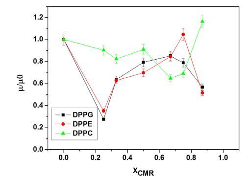 DPcoll 強(qiáng)烈依賴于混合的組成 單層并與 CMR 摩爾比成比例地減少。 從圖 1a 和 b 中提供的數(shù)據(jù)可以看出,在 由于加入了 CMR,xCMR = 0.87(DPPG)和 0.75(DPPE) 在這些單層上形成更有組織的狀態(tài)(Takao 等人,1995 年)。
