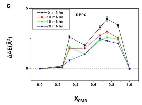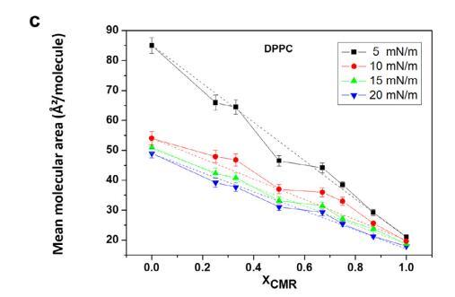 觀察到 CMR/DPPC 與 DAE 的正偏差 由于更不混溶的行為而導(dǎo)致的混合膜(圖 5c 和 6c)。 偏差程度取決于表面 壓力,因?yàn)樵诟叩膲毫ο?,分子變得更?包裝中分子間相互作用的影響變得不那么明顯(Chou 和 Chang,2000)。 令人厭惡的 行為表明相分離有利于分子聚集(Mishra 等,2012)。 得到了類似的結(jié)果 其他香豆素(Sarpietro 等人,2011 年;Chakraborty 等人,2012 年)。