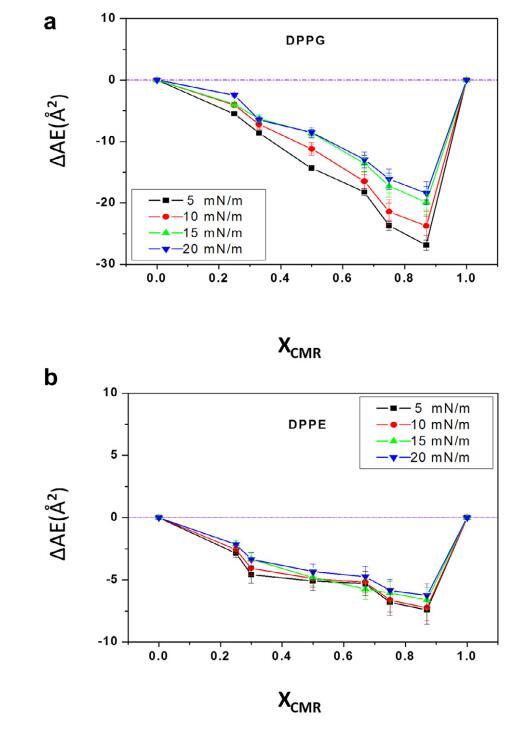分子面積作為 CMR/ DPPG如圖5a所示。 可以看出負(fù)偏差 mma (XCMR = 0.33–0.67) 由于分子吸引力相互作用的增加。 CMR/DPPG 薄膜被認(rèn)為是部分混溶和非理想的浮動(dòng)單層,因?yàn)榫€性度不高 觀察到的。 CMR/DPPE 混合薄膜的結(jié)果在 XCMR=0.25 和 0.67 時(shí)表現(xiàn)出不同的斷裂點(diǎn)(圖 5b)。 DAE 節(jié)目 包裝效率甚至幾何形狀的改進(jìn) 調(diào)節(jié)發(fā)生在較低的 XCMR(圖 6)(Andrade 等人, 2006; 周和張,2000)。