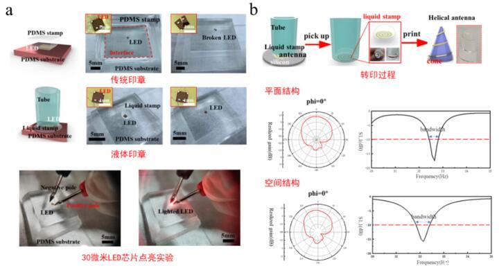 當(dāng)液體印章與待轉(zhuǎn)印器件/單元結(jié)合時,液滴對器件進(jìn)行包裹,進(jìn)而實(shí)現(xiàn)保護(hù)器件的作用。相比于傳統(tǒng)彈性印章轉(zhuǎn)印方法,液體的流變特性充分發(fā)揮作用,使得薄膜器件更容易轉(zhuǎn)印到多種復(fù)雜的空間曲面上。通過對固-液界面粘附力的理論分析,提出了基于液滴印章的轉(zhuǎn)印技術(shù),實(shí)現(xiàn)了柔性薄膜的高度精確可控轉(zhuǎn)印,并通過實(shí)驗(yàn)證實(shí)了理論模型的正確性與該轉(zhuǎn)印方法的可行性。研究人員通過液體印章轉(zhuǎn)印方法,成功實(shí)現(xiàn)了30微米超薄LED芯片的轉(zhuǎn)印集成(圖2a為傳統(tǒng)印章和液滴印章轉(zhuǎn)印對超薄LED芯片轉(zhuǎn)印結(jié)果的對比)與錐螺旋微天線與異形曲面的轉(zhuǎn)印集成(圖2b)。此方法利用了表面張力和毛細(xì)作用,可以實(shí)現(xiàn)轉(zhuǎn)印期間印章-薄膜作用力的精確調(diào)控,進(jìn)而能夠高效、高質(zhì)量地完成超薄器件的轉(zhuǎn)?。焕枚S制備工藝和轉(zhuǎn)印技術(shù),實(shí)現(xiàn)了立體空間微結(jié)構(gòu)和異形界面的集成,為曲面電子器件的設(shè)計與制備提供了一種新的方案。