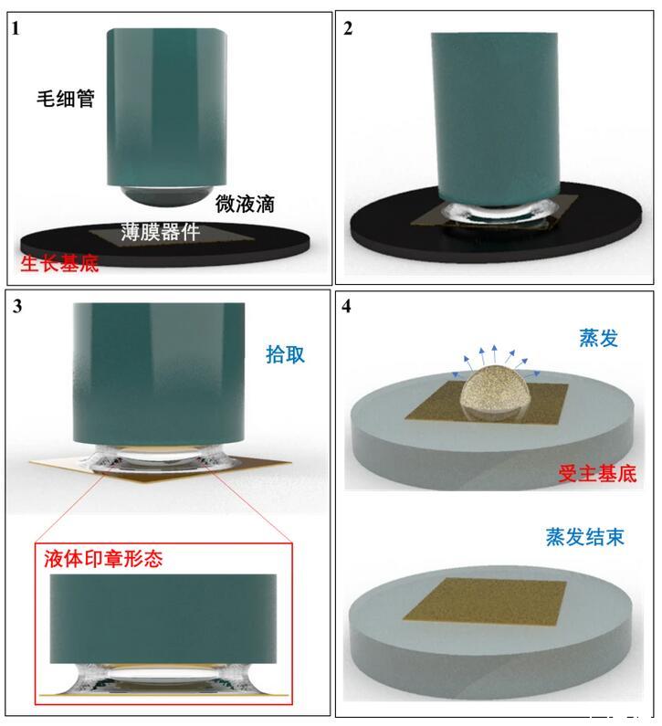 針對當(dāng)前轉(zhuǎn)印技術(shù)中存在的問題,研究人員結(jié)合接觸式和非接觸式轉(zhuǎn)印的特點(diǎn),提出了一種基于表面張力的液滴轉(zhuǎn)印方法,利用液體的流變特性,通過毛細(xì)管對液滴形態(tài)的控制,調(diào)控固-液界面的粘附力,從而實(shí)現(xiàn)柔性器件的轉(zhuǎn)印,該方法減少了超薄柔性器件的轉(zhuǎn)印過程中印章對器件的損傷,同時也為曲面電子器件的制造提供了新的思路。