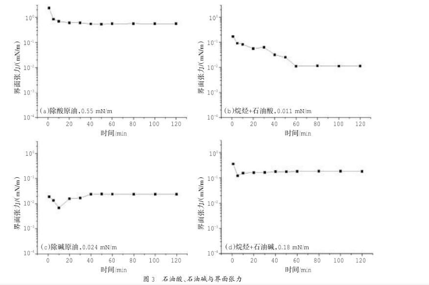 為研究遼河石油酸、石油堿與界面活性之間的關系,首先測量了遼河兩性表面活性劑與原油之間的界面張力,為0.005 2 mN/m,可以超低;也測量了表面活性劑與烷烴之間的界面張力,為1.38 mN/m,界面活性較差;在此基礎上考察石油酸、石油堿對降低界面張力的貢獻。由圖3可以看出,在原油剔除石油酸組分后,界面張力由超低陡然升高至0.55 mN/m,說明石油酸組分對超低界面張力的形成具有非常重要的作用,也說明在遼河油田的兩性表面活性劑二元復合驅中,石油酸組分依然發(fā)揮著原油活性物質的作用;在烷烴組分添加石油酸后,界面張力由1.38 mN/m降低至0.011 mN/m,兩個數(shù)量級的降低,進一步說明石油酸組分與遼河兩性表面活性劑之間具有明顯的相互作用,是有效降低界面張力的重要原油組分。