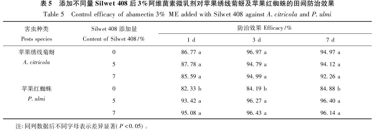 綜合表面張力、接觸角及室內(nèi)毒力測(cè)定結(jié)果,選擇Silwet408添加量分別為5%和7%的阿維菌素微乳劑藥液進(jìn)行了田間防效試驗(yàn)。結(jié)果(表5)與室內(nèi)毒力試驗(yàn)結(jié)果規(guī)律基本一致:添加Silwet408對(duì)提高阿維菌素微乳劑對(duì)蘋果紅蜘蛛田間防治效果作用顯著,而對(duì)蘋果繡線菊蚜防效的影響則不明顯,再次證明Silwet408雖可有效降低阿維菌素微乳劑的表面張力和接觸角,但卻未必一定能提高其對(duì)不同害蟲(chóng)的防效。