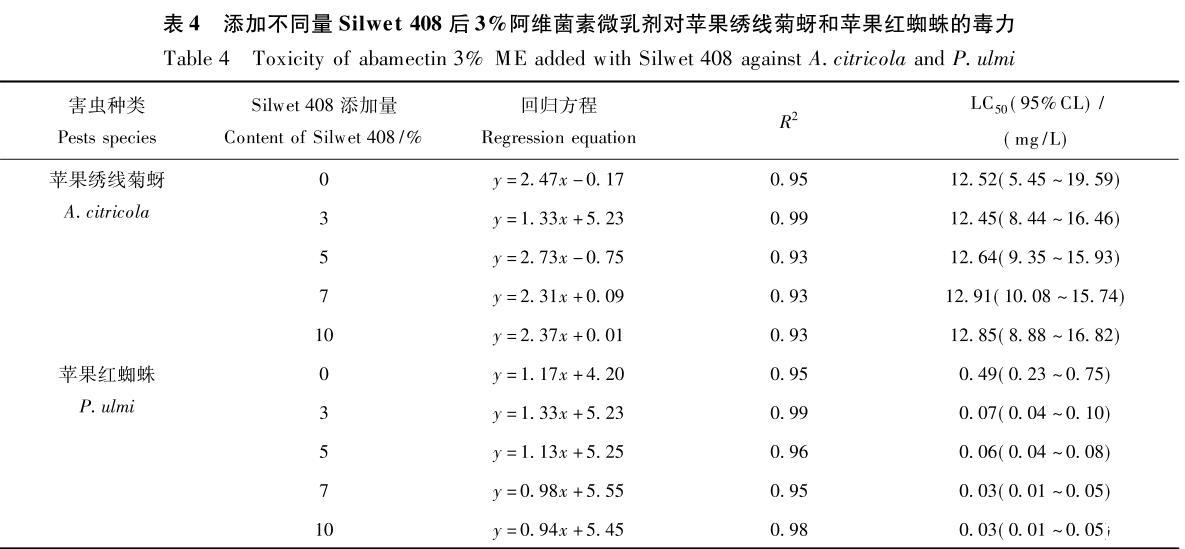 從表4中數(shù)據(jù)可看出:添加Silwet408可明顯提高阿維菌素微乳劑對(duì)蘋果紅蜘蛛的毒力,且隨助劑添加量的增加,藥劑LC50值降低;但添加Silwet408對(duì)阿維菌素微乳劑對(duì)蘋果繡線菊蚜的毒力并無(wú)明顯影響。說(shuō)明Silwet408雖能降低藥液的表面張力及在靶標(biāo)葉面的接觸角,促進(jìn)藥液在葉片上的潤(rùn)濕性,但并不一定能提高其對(duì)害蟲(chóng)的毒力。