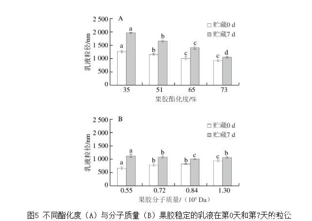 圖5不同酯化度(A)與分子質(zhì)量(B)果膠穩(wěn)定的乳液在第0天和第7天的粒徑