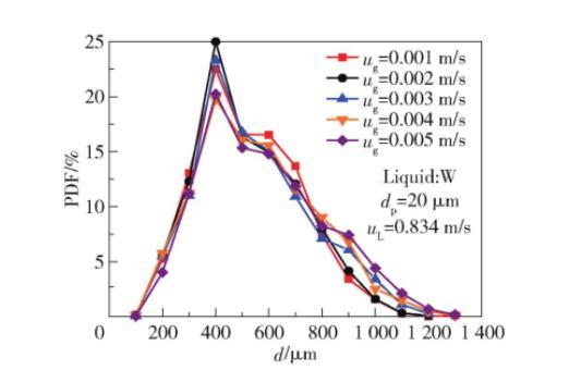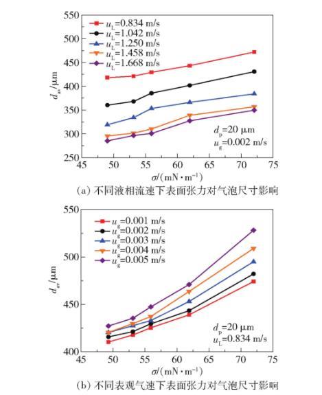 在表觀氣速ug=0.1-0.3 m/s范圍內(nèi),表面張力對氣泡尺寸的調(diào)控作用呈現(xiàn)非線性特征。當(dāng)ug>0.2 m/s時(shí),高表觀氣速引發(fā)的慣性力(Fg=πd2ρgug/4)增強(qiáng),部分抵消了低σ?guī)淼某叽鐪p小效應(yīng)。實(shí)驗(yàn)數(shù)據(jù)顯示,在ug=0.3 m/s條件下,σ從72降至49 mN/m僅使dav減少18%,較ug=0.1 m/s時(shí)的32%減幅顯著降低。