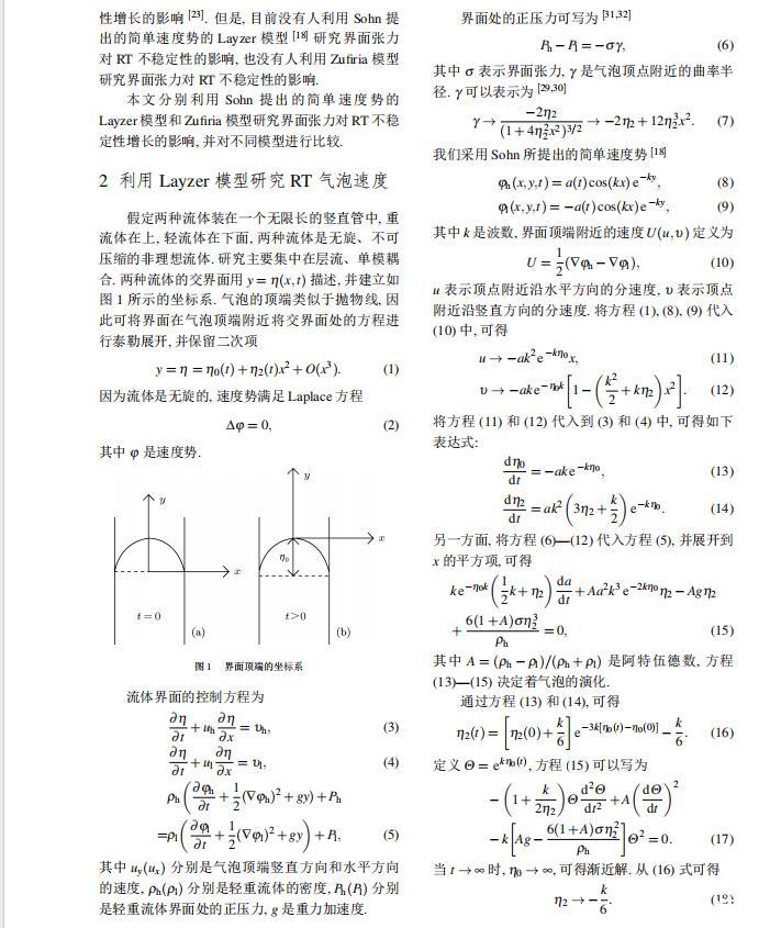 Layzer模型和Zufiria模型都是建立在理想流體之上。然而對實際流體而言,很多因素都可以影響RT不穩(wěn)定性的演化情況,如密度比、黏性、界面張力、壓縮性、外場加速度、Kelvin-Helmholtz不穩(wěn)定性等。Young和Sohn利用Goncharov提出的復(fù)雜速度勢,將Layzer模型推廣并應(yīng)用到非理想流體中,研究了界面張力對RT不穩(wěn)定性增長的影響,發(fā)現(xiàn)界面張力降低了氣泡的增長速率。2011年本文的作者之一利用Zufiria模型研究了黏性對RT不穩(wěn)定性增長的影響。但是,目前沒有人利用Sohn提出的簡單速度勢的Layzer模型研究界面張力對RT不穩(wěn)定性的影響,也沒有人利用Zufiria模型研究界面張力對RT不穩(wěn)定性的影響。