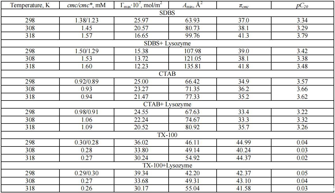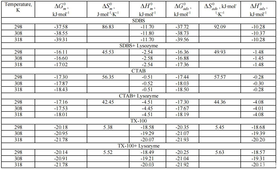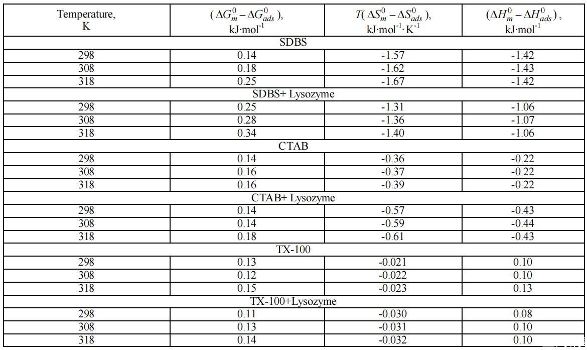 在溶菌酶存在和不存在的情況下,不同種類(lèi)表面活性劑的物理化學(xué)和熱力學(xué)性質(zhì)如下所述:
