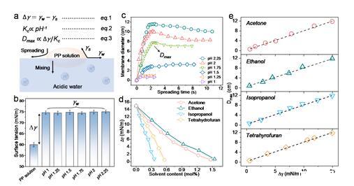 含有聚乙烯亞胺(PEI)和聚苯乙烯磺酸鈉(PSSNa)的水溶液滴在水表面自發(fā)鋪展成膜(圖1,圖2)。一般而言,水溶液液滴與水接觸時首先發(fā)生向水中的擴散與混溶,而非鋪展。為了抑制水-水擴散與混溶,作者設(shè)計了PEI-PSSNa和混合溶液,其pH為堿性。當該溶液液滴與酸性水接觸時,水中含有的大量質(zhì)子促使PEI高分子鏈上的氨基質(zhì)子化,隨后帶正電的PEI與PSSNa在水-水界面上發(fā)生靜電絡(luò)合,有效抑制了溶液向水中的擴散與混溶。與此同時,PEI-PSSNa的表面張力比水低,液滴因此在水表面可自發(fā)鋪展,而非混合。二者協(xié)同,促使了水溶液液滴在水面進行自發(fā)鋪展。