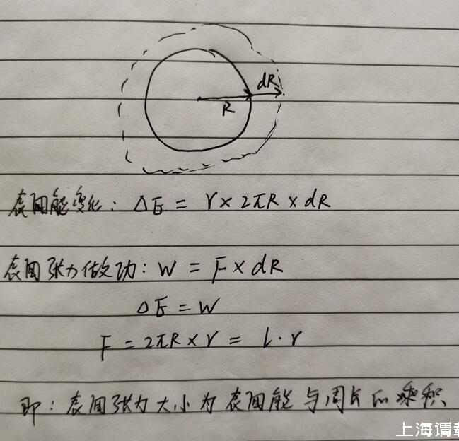 假設一半徑為R的圓面向外擴張距離為dR,這個過程表面張力做功等于表面能的變化。具體推導如下圖。