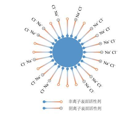 抑塵劑主要由陰離子表面活性劑、非離子表面活性劑以及其他助劑組成。其中,表面活性劑是一種具有兩親性的物質(zhì),加入少量能使其溶液體系的界面狀態(tài)發(fā)生明顯變化,是抑塵劑的重要組成部分。如圖4所示,煤塵表面暴露著大量的極性有機基團,水在煤塵表面很難發(fā)生潤濕行為;抑塵劑中的表面活性劑親油端與煤塵表面的有機基團具有較好的相容性,能夠在煤塵表面定向排列并且將親水基團引入煤塵表面,增加了水與煤塵之間的潤濕能力。無機鹽的引入對于陰離子表面活性劑具有增效作用。根據(jù)雙電層理論,雙電層可以分為緊密層和擴散層,當(dāng)溶液中加入無機鹽后,無機鹽中的離子會壓縮擴散層,使得擴散層厚度減小,從而降低了界面能;同時其無機鹽離子還能減小雙電層中的靜電力作用,促進了抑塵劑在煤塵表面的吸附,提高了潤濕性能。