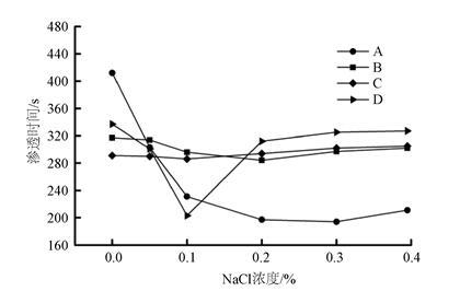 從圖4可知,NaCl對于提高抑塵劑潤濕性能的作用更為顯著。因此,在抑塵劑中加入不同濃度的NaCl,研究無機鹽濃度對煤塵NR的潤濕性能的影響。如圖5所示,少量的NaCl的引入,能夠降低抑塵劑在煤塵表面的滲透時間。NaCl的引入能夠降低抑塵劑溶液的表面張力,使抑塵劑在煤塵表面的接觸角不斷降低[18]。另外,無機鹽能夠增強表面活性物質(zhì)在煤塵表面的吸附能力,降低煤塵與抑塵劑之間的界面能,提高了抑塵劑對煤塵的潤濕性能;煤塵中含有大量的酚羥基、羧基等有機基團,因此煤塵表面呈現(xiàn)電負性[19]。當(dāng)NaCl含量持續(xù)增加時,抑塵劑A、B、C在煤塵表面的滲透時間趨于平穩(wěn),而抑塵劑D出現(xiàn)滲透時間增加后平緩的趨勢。相比之下,抑塵劑B、C對于NaCl的敏感程度較低,隨著NaCl含量增加其潤濕能力變化不大;NaCl對抑塵劑A、D在煤塵表面的潤濕能力影響程度較大。