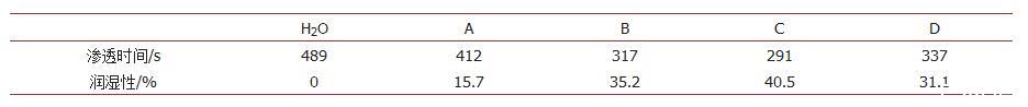分別選用了四種抑塵劑A、B、C、D,使用正向滲透法研究了抑塵劑對于煤塵NR的潤濕能力的影響。如圖2所示,在水中加入抑塵劑可以增加在煤塵NR表面的潤濕能力,滲透時間大幅降低。四種抑塵劑的潤濕能力數(shù)據(jù)如表1所示,純水在煤塵表面4 cm的滲透時間為489 s。相比之下,抑塵劑C、B和D均能夠較大程度提高對煤塵的潤濕能力,滲透時間分別降低至291 s、317 s和337 s,潤濕能力相比純水分別提高了40.5%、35.2%和31.1%。抑塵劑A的潤濕能力相對較差,滲透相同煤塵距離所需要的時間為412 s,潤濕能力比純水僅提高了15.7%。
