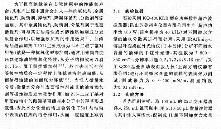【摘要】:為了有效監(jiān)控絕緣油的運行狀態(tài),采用定量分析方法探討了微量水分對絕緣油表面張力的影響規(guī)律。通過配制不同微水含量的絕緣油樣,對每組油樣進行表面張力測試,然后對油樣進行紅外光譜掃描,獲取了油樣中水分在特征波數(shù)處(1 640,3 400,3 450,3 615cm-1)的吸光度值。分析了油液中2,6-二叔丁基對甲酚(T501)等添加劑對油樣表面張力變化規(guī)律的影響。結果表明:油樣中水分含量與水分特征吸光度值之間有較好的相關性(相關系數(shù)分別為0.964 1,0.984 8,0.984 5,0.944 0),油樣表面張力和1 640,3 400,3 450,3 615,3 650cm-1波數(shù)處油樣吸光度值的變化亦均呈現(xiàn)良好的正相關性。建立了油樣表面張力與特征波數(shù)處油樣吸光度值的多元線性回歸模型,擬合精度為0.992 8;根據(jù)模型得到的表面張力計算值與實際測量值誤差為-0.07~0.06%,吻合性較好。文中的實驗可為含微水絕緣油的表面張力檢測提供理論支撐。