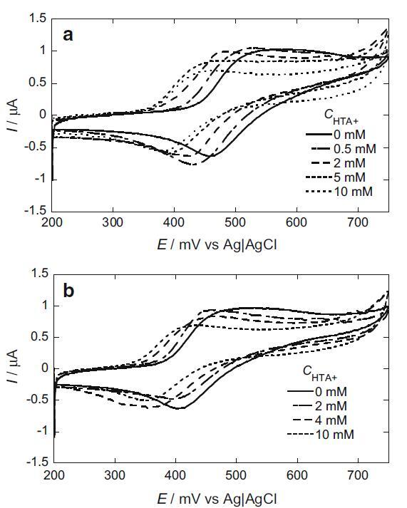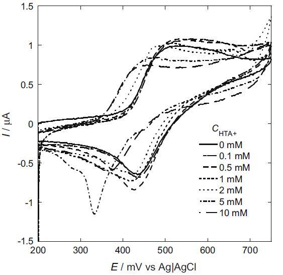我們還研究了 HTA+ 陽離子的影響(圖 6)。 來自界面張力測量的 HTA+ 離子的 cmc 與圖 6 標(biāo)題中所述的 CV 測量溶液相同,為 3.95 mM。 I2/I? 的陽極和陰極峰均高于不存在 HTA+ 時(shí)的峰。 陽極和陰極峰值電流的增加是由于被捕獲的 I? 和 I2 從 hp-β-CD 釋放到主體中,這是由 hp-β-CD 腔中的 I? 和 I2 置換引起的與 HTA+。 另一方面,隨著 HTA+ 的濃度增加到 cmc 以上,陽極和陰極峰值電流都變得低于預(yù)膠束濃度下的峰值電流。 在 I2 和 I- 鍵合到膠束經(jīng)歷電子轉(zhuǎn)移之前,膠束必須轉(zhuǎn)向,使 I2 和 I- 面向電極表面。 它導(dǎo)致峰值電流的降低。 此外,陽極和陰極峰值電位都向負(fù)方向移動(dòng)。 這表明溶解在 HTA+ 膠束中的 I2 比鍵合到 HTA+ 膠束表面的 I- 更穩(wěn)定。 隨著 HTA+ 濃度增加到 5 mM,在 330 mV 處觀察到一個(gè)尖銳的吸附減少峰。 已知在不存在任何表面活性劑的情況下,在鉑電極表面形成的 I2 會(huì)吸附在電極表面 [19]。 在我們的系統(tǒng)中,HTA+ 在低 HTA+ 濃度下抑制了 I2 的吸附。 然而,隨著HTA+濃度的增加,形成了HTA+單層,導(dǎo)致電極表面HTA+單層中的I2被吸收。 隨著 HTA+ 濃度增加至 10 mM,吸附還原峰消失。 在這個(gè)濃度下,在電極表面形成的 I2 溶解到 HTA+ 膠束中。 因此,沒有觀察到吸附峰。