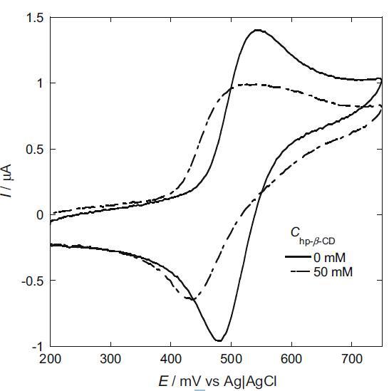 在這里,我們選擇 I2/I? 作為電化學(xué)探針,因?yàn)?I? 的電荷有望使其與陽離子膠束的結(jié)合變得容易,并且電中性 I2 有望在膠束中表面活性劑的疏水部分之間增溶并溶解在電極表面的表面活性劑單層中。 我們研究了 hp-β-CD 對 I2/I- 氧化還原峰的影響(圖 5)。 在沒有 hp-β-CD 的情況下,觀察到 I- 在約 530 mV 處的陽極峰和 I2 在約 480 mV 處的陰極峰。 在 50 mM hp-β-CD 存在下,陽極和陰極峰值電流均降低,并且它們的峰值電位向負(fù)方向移動(dòng)。 陽極峰值電流的降低是由 I? 與 hp-β-CD 的親水表面結(jié)合引起的。 另一方面,陰極峰值電流的降低是由 hp-β-CD 疏水腔中包含 I2 引起的 [18]。 峰值電位的負(fù)移表明結(jié)合在 hp-β-CD 腔中的 I2 比結(jié)合到 hp-β-CD 表面的 I- 更穩(wěn)定。